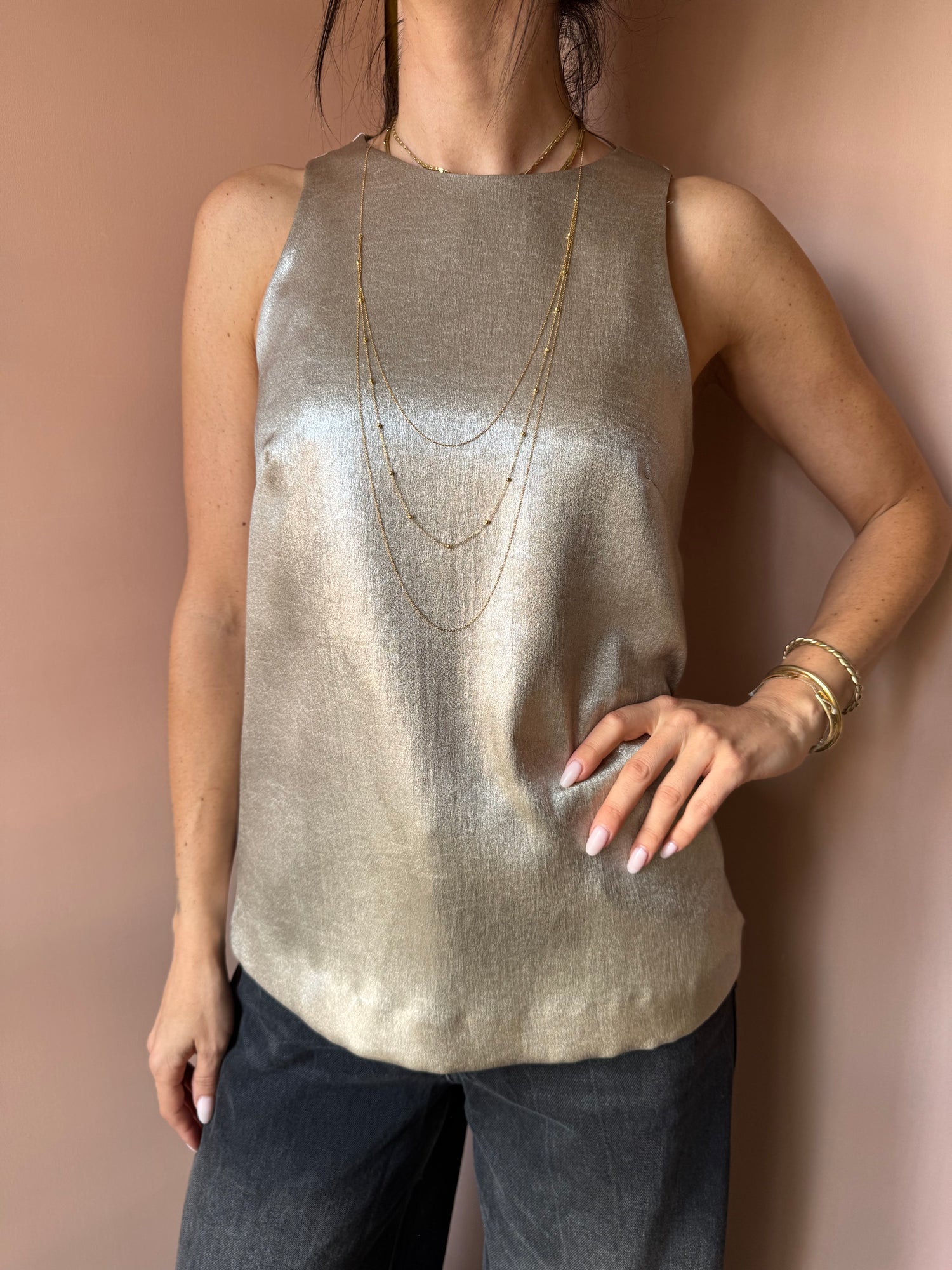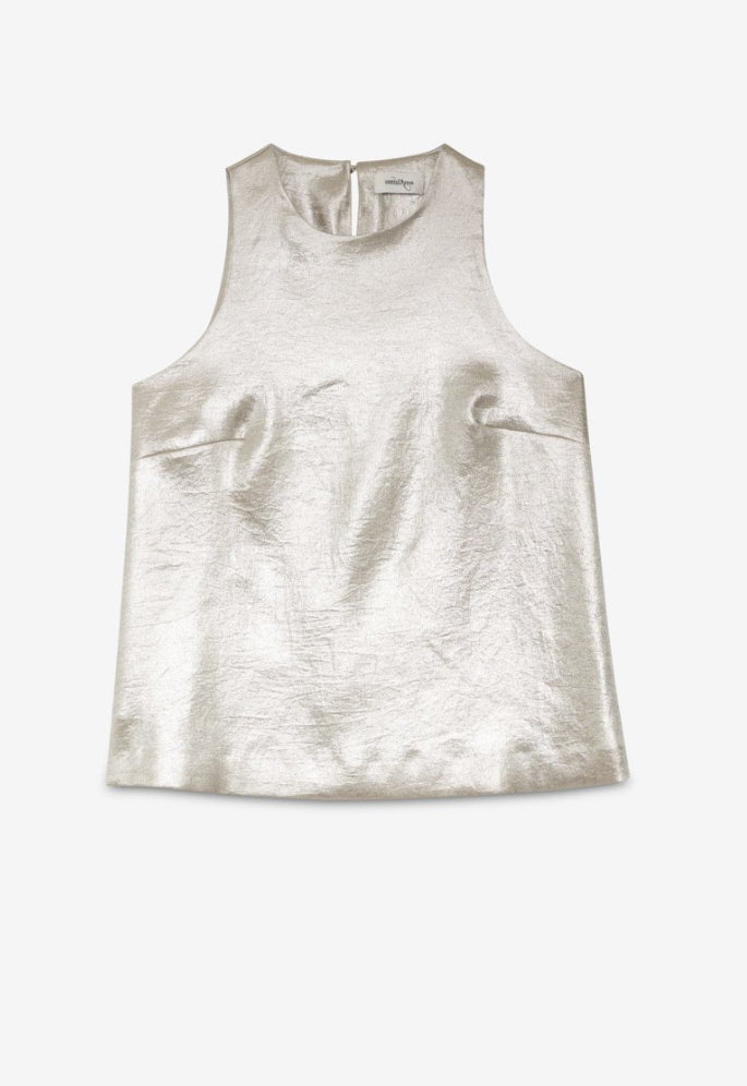 Top smanicato in tessuto trilobato con effetto lucente e chiusura a goccia.